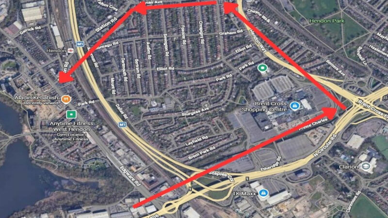 Instead, continue driving towards Brent Cross Shopping Centre. Take the first exit after Brent Cross towards Hendon Central, then follow the signs to West Hendon Broadway to reach Aladin Kebabish (NW9 7EA).